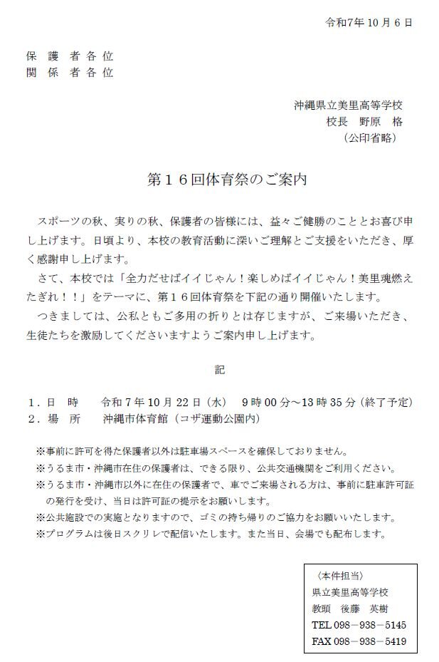 第16回体育祭のご案内 及び 駐車場についての連絡